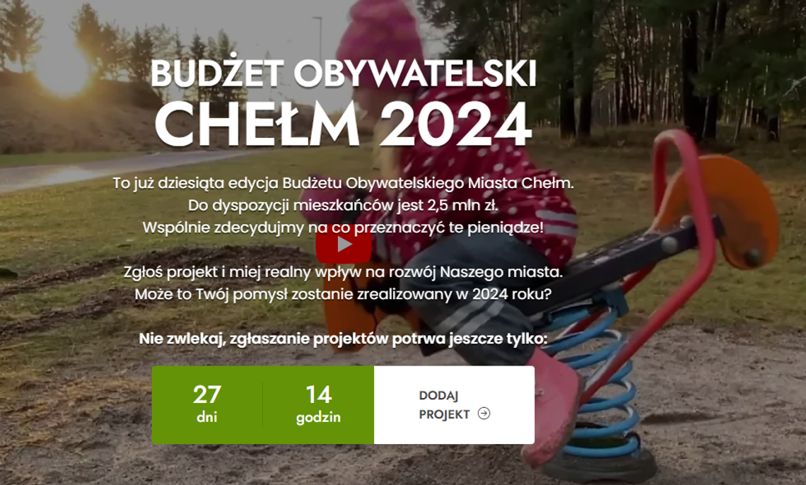 - Ruszył nabór wniosków do Budżetu Obywatelskiego Miasta Chełm. To już jego 10 edycja. W tym roku do dyspozycji jest 2,5 mln złotych.
