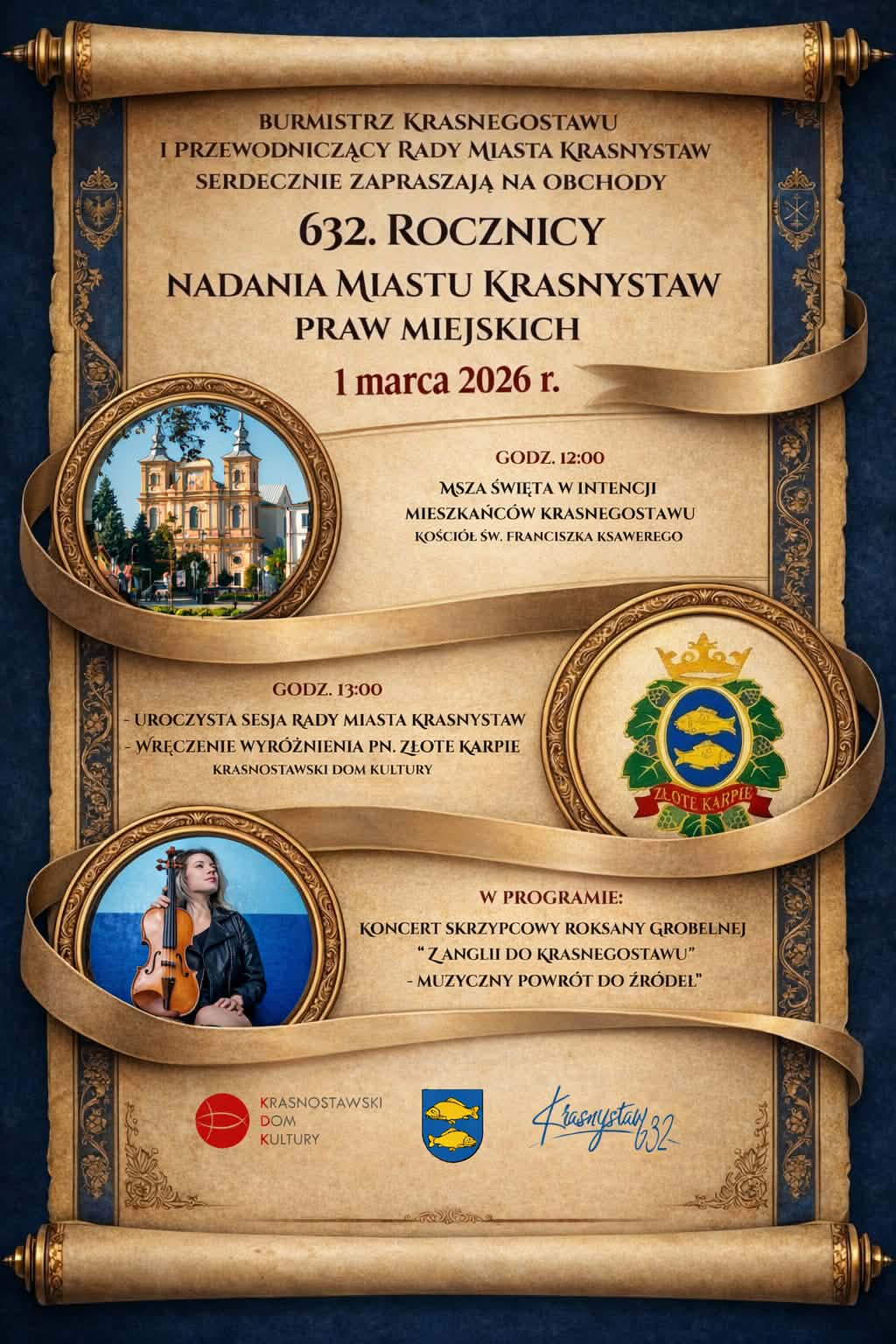 Wyjątkowym punktem programu będzie koncert skrzypcowy Roksany Grobelnej pt. „Z Anglii do Krasnegostawu – muzyczny powrót do źródeł”. Artystka, pochodząca z Krasnegostawu, miała już okazję zaprezentować swój talent publiczności podczas Kraszczadzkiego Jarmarku Bożonarodzeniowego. Obecnie rozwija karierę muzyczną w Anglii, a powrót do rodzinnego miasta z koncertem ma dla niej szczególny, sentymentalny wymiar. Uroczystości 632-lecia są otwarte dla wszystkich mieszkańców, którzy chcą celebrować to ważne dla Krasnegostawu wydarzenie.